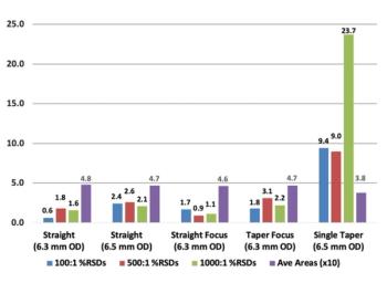 Gas chromatography (GC) liners are offered in dozens of different configurations and internal diameters. The liner is designed with baffles or glass wool to best vaporize and mix the sample prior to transferring it to the head of the analytical column. Split liners have considerably more flow and are designed to handle high split ratios. For example, some liners have a glass dimple at the bottom to allow for higher flow rates (low pressure drop). Some split liners have an outer diameter of 6.3 mm while splitless liners have an outer diameter of 6.5 mm. It has been reported that these liners have been used interchangeably, which begs the question: Does the outer diameter matter?
