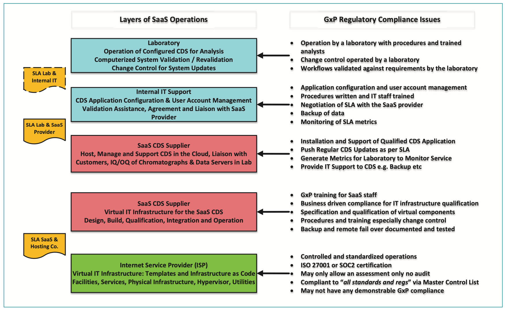 Who are involved with a SaaS CDS? Figure 2 shows the entities involved with a SaaS CDS and the responsibilities of each for the correct functioning of the CDS as well as overall compliance and data integrity. Like a house of cards, all must work to ensure that the system functions and is compliant. Starting from the bottom is the ISP, followed by the SaaS provider, the company IT department, and, balanced precariously on top, is your laboratory.